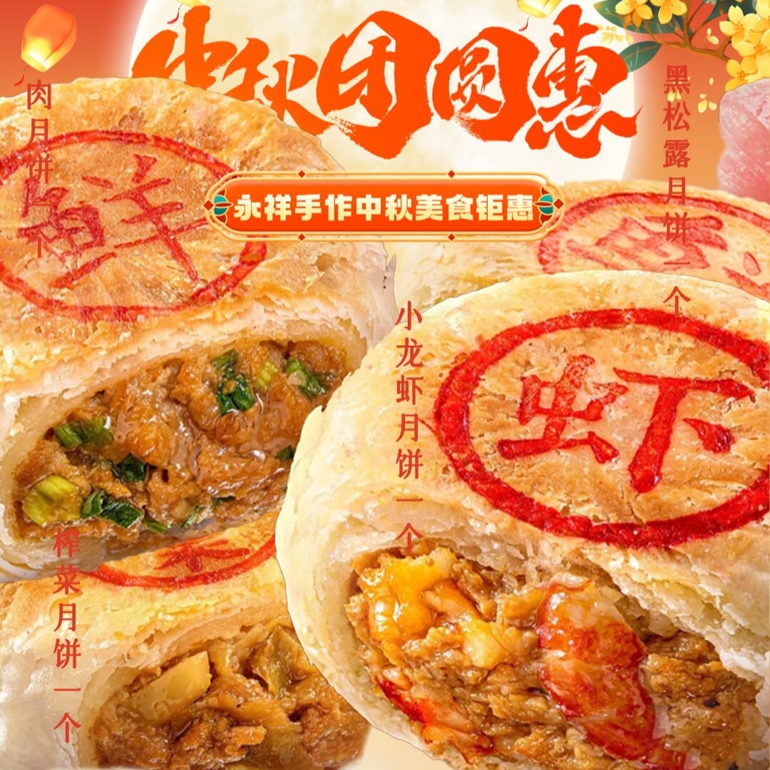 招牌四味月饼套餐:鲜肉月饼1个;榨菜肉月饼1个;小龙虾蛋黄鲜肉月饼1个;黑松露鲜肉月饼1个
